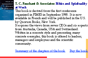 2. Benoît, Yves (2000). The Quality/Performance of Pastoral Care : Clientele Satisfaction and Efficiency of the Hospital Stay, in T.C. Pauchant and Associates, op. cit. Summary 3. Berthouzoz, Roger (2000). Economic efficiency, ethical foundations and spiritual values in the management of organizations, in T.C. Pauchant and Associates. Summary 4. Daniluk, Vera (2000). Managing a public organization: a projection of one's ethical and spiritual values, in T.C. Pauchant and Associates. Summary 5. Dion, Michel (2000). Business ethics and spirituality among Jews, Christians and Muslims, in T.C. Pauchant and Associates. Summary 6. Lefebvre, Solange (2000). The "crisis of belief" in business and the need for dialogues on the meaning of work, in T.C. Pauchant and Associates. Summary 7. Ouimet, J.-Robert (1998). New tools for company management. Contribution to human happiness and profitability, PhD Dissertation, Faculty of Economic and Social Sciences, University of Fribourg, Switzerland. 8. Ouimet, J.-Robert (1999). Reconciling human happiness and corporate profitability: Feasible mission! (2nd ed.), Montreal, Ouimet Cordond Bleu Publications. Summary 9. Ouimet, J.-Robert (2000). Reconciling Human happiness and profitability: mission possible thanks to 16 new management tools, in T.C. Pauchant and Associates. Summary 13. Mitroff, Ian I. and Elisabeth A. Denton (1999). A spiritual audit of corporate America. A hard look at spirituality, religion and values in the workplace, San Francisco, Calif. : Jossey-Bass Publishers. Book summary and purchase 14. Mitroff, Ian. I. (2000). Spirituality at work: the next major challenge in management, in T.C. Pauchant and Associates. Summary 15. Pauchant, Thierry and Associates (1995), In search of Meaning. Managing for the Health of individuals, organizations and the natural environment, San Francisco, CA.; Jossey-Bass Publishers. Summary 16. Pauchant, Thierry et Collaborateurs (2000). Ethics